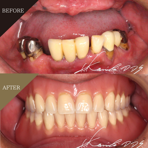 | 治療内容 | 下あごをレジリエンツテレスコープ、上あごは自費の総入れ歯で治療。同時に歯周病治療、根管治療、虫歯治療、噛み合わせ治療を実施。 |