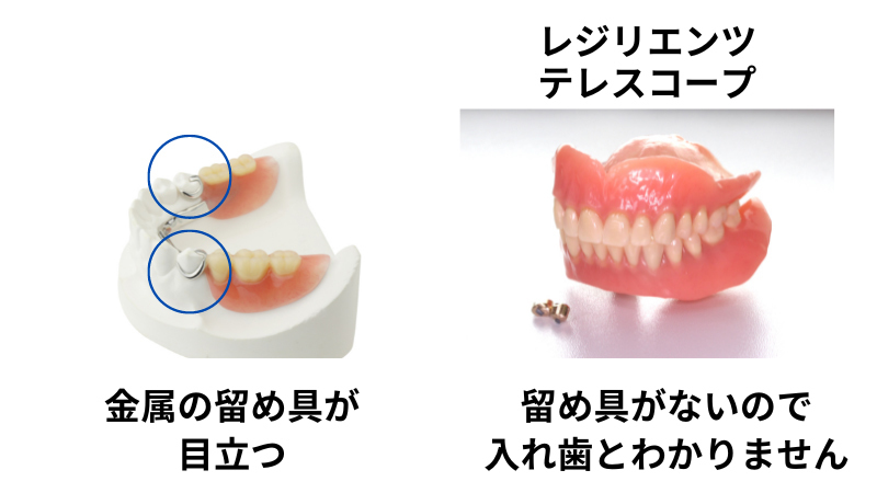 でも、歯ぐきで支えるレジリエンツテレスコープなら、金属の留め具がないので、他人に入れ歯と気づかれにくいのです。